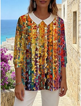 Mulheres Camisa Social Botões Imprimir Geométrica Bloco de cor à moda Moderno Manga Longa Decote V Tops regulares Diário Feriado Azul Castanho Avermelhado Preto Marron Verão