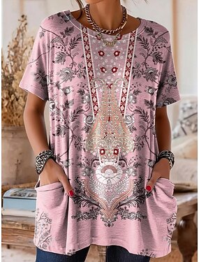 Mulheres Camiseta Imprimir Gráfico Geométrica Estampado Cashemere Vintage à moda Casual Manga Curta Gola Redonda Tops longos Diário Final de semana Rosa Verão Primavera