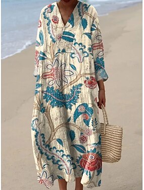 Mulheres Vestido Longo Vestido de turno Casual Diário Para Noite Ajuste Largo Floral Gráfico Manga Longa Decote V Azul Vermelho Bege Verão Primavera