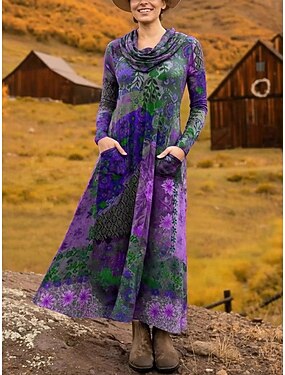 Mulheres Vestido midi Vestido da bainha Vestido A Line Vestido justo e evasê Férias Festa Casual Escritório Diário Encontro Normal Floral Gráfico Manga Longa Gola Boba Roxo Marron Verde Primavera