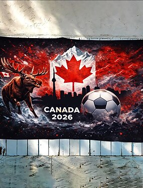 Bandeira do Canadá 2026 - exibindo um majestoso alce, a icônica folha de bordo e uma bola de futebol. &Paisagem urbana, obras de arte impressionantes, tecido de qualidade