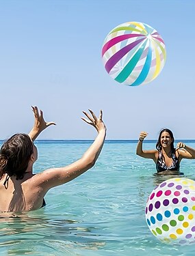 Conjunto de 2 bolas de praia infláveis de PVC com estampa de bolinhas e listras coloridas, ideais para piscina, festa na praia e outras atividades ao ar livre.