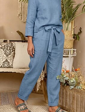 Mulheres Conjuntos de calças Bolero Linho de algodão sintético Meia Manga Decote Redondo Côr Sólida Moda Roupa de rua Casual Diário Ao ar livre Azul Branco Bege Verão Normal