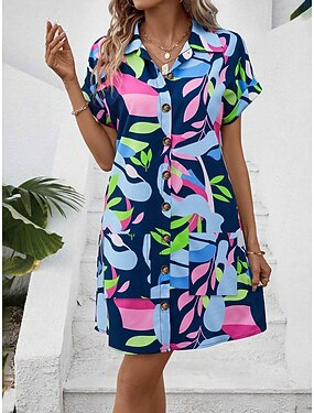 Mulheres Minivestido Camisetão Vestido casual Vestido estampado Moda Moderno Diário Praia Final de semana Normal Floral Manga Curta Colarinho de Camisa Azul Verão Primavera Outono