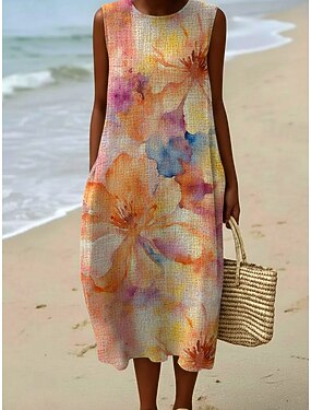 Mulheres Vestido midi Vestido de turno Vestidos Para o Verão Vestido casual Moda Moderno Diário Ao ar livre Férias Normal Floral Sem Manga Gola Redonda Amarelo Verão Primavera