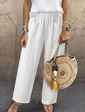 Calça feminina de verão, 100% algodão e linho, cor lisa, clássica, comprimento até o tornozelo, cintura média, bolso, modelagem folgada, design com elástico e cordão, confortável, respirável, tecido microelástico macio, ideal para uso casual no dia a dia,