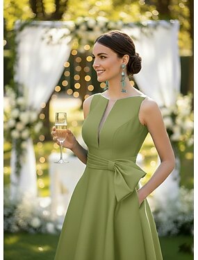 Linha A Longuette Vestidos de baile Elegante Sem Manga Decote V Reunião de Classe Verão Bolsos Cetim com Laço(s)