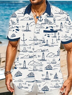 Homens Náutico Veleiro Camisa havaiana camisa de botão Manga Curta Havaiana Vintage retrô Férias Feriado Roupa de Praia Verão Primavera Aberto para a Lateral camisas de colarinho Um bolso frontal