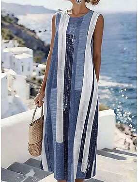Mulheres Vestido no Joelho Vestido Boho Vestidos Para o Verão Vestido casual Vestido De Algodão Elegante Moda Moderno Ao ar livre Férias Para Noite Normal Tecido Sem Manga Decote U Azul Preto Branco