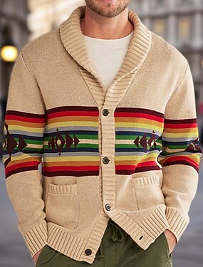 Homens Sueter Cardigan Suéter Cortado Suéter de malha Estriado Tricotar Tops regulares Bolsos Botões Listra Lapela Moda Clássico Férias Roupa Diária Roupa Outono Inverno Caqui M L XL