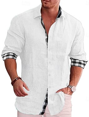 Homens Camisa Social Camisa de linho camisa de praia camisa de botão Xadrez Casual Férias Preto Branco Rosa Vinho Manga Longa Aberto para a Lateral Verão Primavera Roupa Patchwork