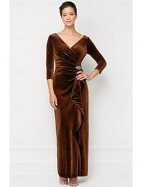 Tubinho Longo Vestido de convidada de casamento Vestido formal Vestido de noite Vestido Para Mãe dos Noivos Manga Longa Decote V Elegante Vintage Formal Veludo com Franzido Cor Única