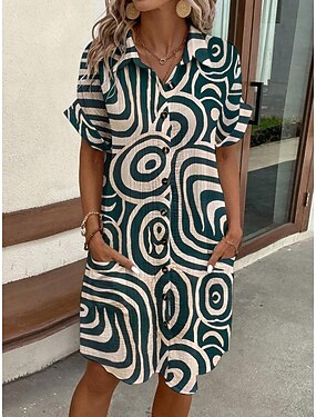 Mulheres Minivestido Camisetão Vestido casual Vestido estampado Moda Moderno Diário Praia Final de semana Normal Geométrica Manga Curta Colarinho de Camisa Verde Verão Primavera Outono