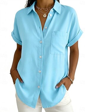 Mulheres Camisa Social Blusa Bolsos Botões Côr Sólida Tecido Vintage à moda Manga Curta Colarinho de Camisa Tops longos Diário Feriado Para Noite Preto Branco Rosa Laranja Cinzento Verão Primavera
