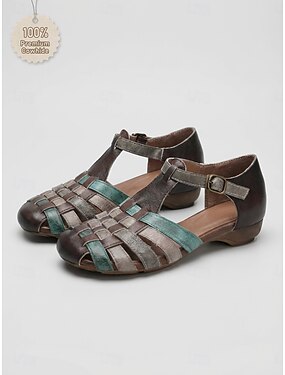 Sandálias femininas de couro trançado cor café – rasteirinhas confortáveis com tira em T e fivela ajustável, sandálias respiráveis feitas à mão para o verão, perfeitas para o campo, jardim e uso