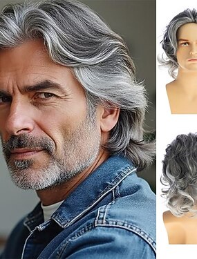 Peruca masculina curta, ondulada e cinza, sintética, em camadas, para cosplay, fantasias e festas.