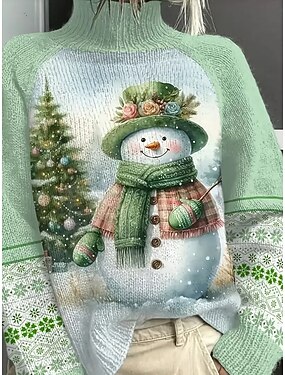 Mulheres Suéter Pulôver Diário Casual Gráfico Árvore de Natal Boneco de Neve Estriado Gola Alta Tricotado Imprimir Manga Longa Tops regulares Tricotar Ao ar livre Final de semana Verde Outono Inverno