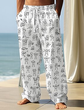 Homens Calças Calças largas Calça casual Cintura elástica com cordão Calças de linho com bolsos Pessoas Boneco de palito Comprimento total Ao ar livre Férias Engraçado Preto Branco Sem Elasticidade