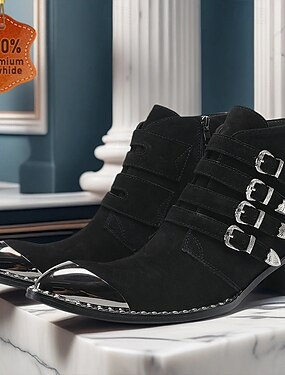 Botas masculinas de couro preto com estampa de cobra e fivelas prateadas – design exclusivo para quem dita tendências, perfeitas para festas e eventos especiais.