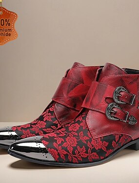 Botas punk masculinas de couro legítimo vermelho com padrão geométrico e tiras de fivela dupla, botas 100% couro bovino estilo western para moda de palco e boate