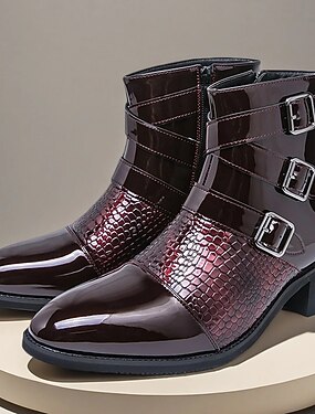 Botas masculinas de couro sintético envernizado cor bordô com três fivelas e textura de crocodilo - calçado moderno para usar à noite, em festas e ocasiões especiais.