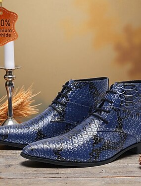 Botas masculinas de couro azul com estampa de cobra e biqueira metálica – design moderno e estiloso, perfeitas para eventos noturnos e looks antenados.