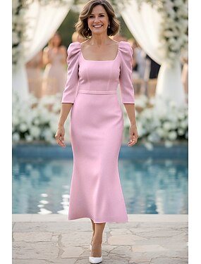 Sereia Longuette Vestido de festa Vestido Coquetel Vestido de convidada de casamento Vestido Para Mãe dos Noivos Manga 3/4 Decote Quadrado Elegante Vintage Convidado do casamento Festa de Casamento