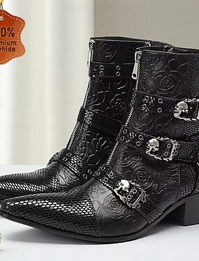Botas masculinas de couro com padrão de píton vermelho, tiras de fivela dupla, biqueira de metal e detalhes de rebites, botas western 100% couro bovino para palco e festas