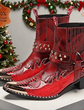 Botas de cano curto masculinas com estampa de cobra vermelha e branca – design moderno com detalhes de tachas, ideais para eventos e festas natalinas com temática festiva.