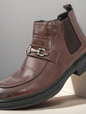 Botas Chelsea masculinas marrons com fivela de metal, botas sociais de couro sintético com cadarço e cano curto para uso profissional, de escritório e formal