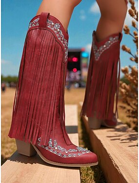 Botas de cowboy femininas com franjas vermelhas e detalhes bordados – botas de montaria retrô de cano alto para festivais, rodeios, festivais de música e trajes country