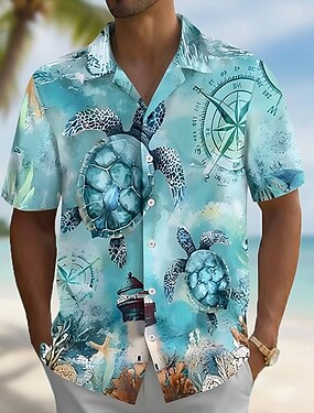 Homens Bussola tartarugas Criaturas marinhas Camisa havaiana camisa de botão Camiseta Aloha Manga Curta Havaiana Férias Roupa de Praia Verão Primavera Aberto para a Lateral Impressão 3D camisas de