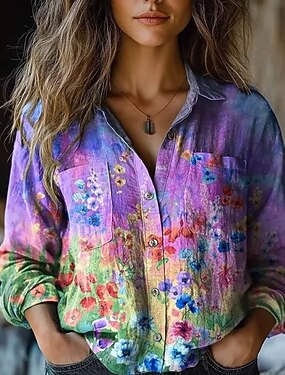 Camisa Feminina Linho Respirável Leve Botão Túnica Camisa Colarinho Manga Longa Gráfico Floral Vintage Uso Diário Estiloso Diário de Férias Vestuário Impressão Branco Verde Claro Marrom Claro Azul
