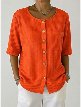 Mulheres Camisa Waffle Bolsos Botões Vintage à moda Manga Longa Tops longos Casual Amarelo Rosa Azul Marinha Azul Céu Laranja Verão Primavera