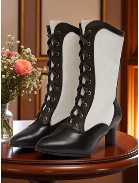 Botas femininas vermelhas e pretas de cano médio com cadarço, estilo vitoriano, dos anos 1920, estilo retrô steampunk eduardiano, para cosplay, teatro e festas de Gatsby