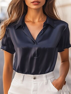 Mulheres Camisa Social Elegant Top de cetim Tops de verão Franzido Patchwork Botões Côr Sólida Tecido Elegante Vintage Diário Manga Curta Colarinho de Camisa Tops regulares Diário Trabalho Feriado