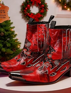 Botas de cowboy masculinas de couro com design de chamas vermelhas e pretas, biqueira de metal e detalhes em tachas, botas de cano curto estilo western 100% couro bovino para palcos e clubes