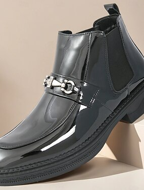 Botas Chelsea pretas envernizadas masculinas com detalhes em corrente de metal, sapatos sociais de festa para clubes e eventos noturnos