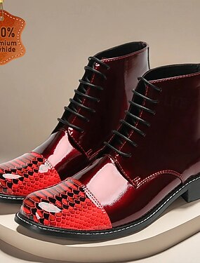 Botas masculinas de couro legítimo bordô com estampa de cobra e biqueira de metal – calçados para performance em palco de rock