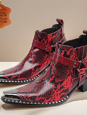 Botas masculinas de couro legítimo vermelho com padrão de cobra, bico de metal e zíper, botas de cano curto estilo western 100% couro bovino para festas, apresentações e moda de boate