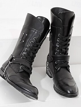 Botas de combate masculinas pretas de couro sintético com cadarço, sola robusta, design robusto e estilo militar – perfeitas para motociclistas, moda punk rock e uso casual ao ar livre