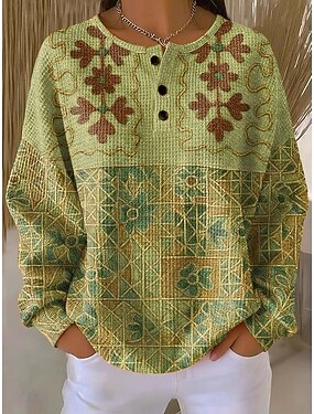 Mulheres Camiseta Waffle Tops tricotados texturizados Camiseta Bloco de cor Imprimir Frente do botão Gráfico Geométrica Abstrato Vintage à moda Clássico Manga Curta Gola Redonda Henley Tops longos