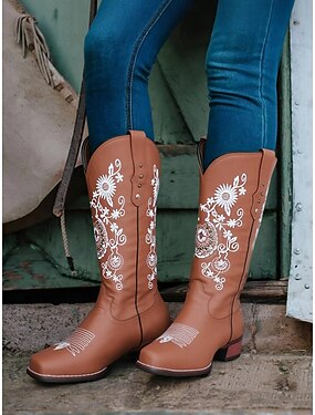 Botas de cowboy femininas marrons com bordado floral branco, bico quadrado e salto baixo confortável para uso casual no campo