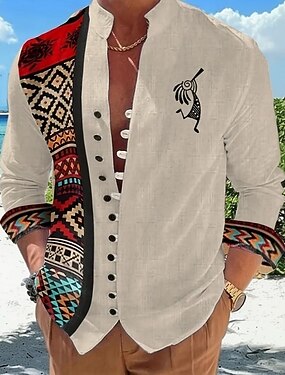 Homens asteca Cultura indiana Kokopelli Camisa Social Camisa de gola alta Manga Longa Étnico Vintage retrô Férias Roupa Diária Para Noite Primavera Outono Colarinho Mandarim Faixa Botão para baixo
