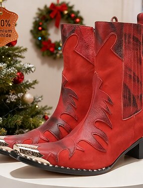 Botas de cano curto masculinas em couro vermelho brilhante – acabamento elegante e brilhante com salto bloco confortável, uma escolha estilosa para eventos de Natal.
