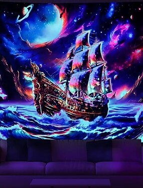 Tecido Tapestry que brilha no escuro Festa UV Reativa Oceano Navio Pirata Trippy Paisagem Natural Nebulosa Tecido Tapestry Suspenso Arte de Parede Mural para Sala de Estar Quarto