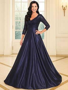 Linha A Longo Vestido de Derby Vestido Para Mãe dos Noivos Meia Manga Decote V Elegante Brilho & Glitter Kentucky Derby Cetim com Lantejoulas