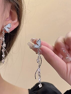 brincos pendentes elegantes em forma de borboleta – brincos longos de corrente prateada com detalhes em cristal para mulheres