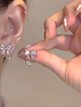 Brincos de laço prateados com cristal transparente e pingente de cruz – brincos pendentes elegantes para mulheres.