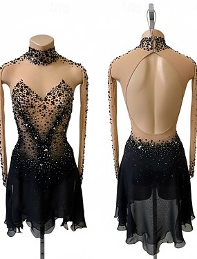 Vestidos para Patinação Artística Mulheres Patinação no Gelo Vestidos Preto Patchwork Sem costas Elastano Com Transparência Elasticidade Alta Treino Competição Roupa para Patinação Clássico Cristal